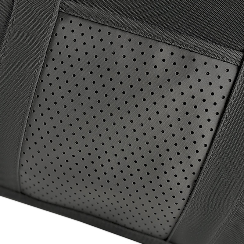 가방 앞면에는 통기성이 좋은 구멍 뚫린 EVA 소재로 만든 편리한 수납 포켓이 있어 가방에 독특하고 세련된 느낌을 더합니다. 이 포켓은 휴대전화, 열쇠 또는 기타 작은 소지품과 같이 자주 사용하는 물건을 보관하기에 좋습니다. 왼쪽에는 작은 운동 장비나 물병을 넣을 수 있는 메쉬 포켓이 있으며, 오른쪽에는 신발을 다른 소지품과 분리하여 보관할 수 있는 신발 수납 공간이 있습니다.