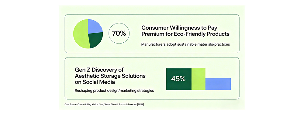 From a consumer behavior perspective, approximately 70% of consumers are willing to pay a premium for eco-friendly products, encouraging manufacturers to adopt sustainable materials and production practices. In addition, 45% of Gen Z consumers turn to social media to discover aesthetically appealing (“Instagram-worthy”) storage solutions before making a purchase(Cosmetic Bag Market Size, Share, Growth Trends & Forecast [2034]), a trend that is reshaping both product design and marketing strategies.