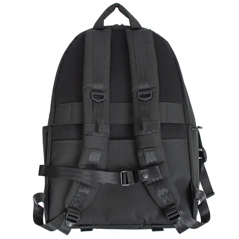 For long-term comfort, the black backpack is equipped with ergonomic shoulder straps and a stabilizing chest strap to distribute weight evenly during extended wear. A reinforced, soft top handle supports comfortable hand carry. Travel-friendly details such as a suitcase fixing belt and external attachment systems allow secure transport during airport travel or when carrying items like tripods or skateboards. The shoulder straps also feature discreet details, including a hidden small pocket for card storage and an elastic loop designed to secure earphones for quick and easy access.
