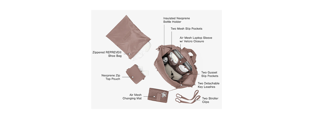 추가 기능 2: 모든 Dagne Dover Indi 기저귀 백팩에는 REPREVE® 재활용 소재로 만든 기저귀 교환 패드, 신발 가방, 더스트 백이 함께 제공됩니다.