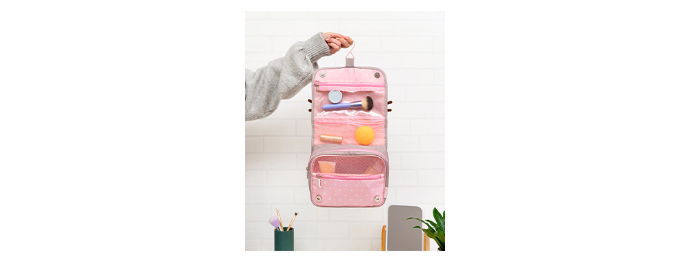 호텔 욕실 카운터의 평균 면적은 0.5제곱미터 미만입니다. 360도 회전 가능한 금속 후크가 달린 저희 행잉 메이크업 백은 이러한 수직 공간을 정리된 수납공간으로 바꿔줍니다.